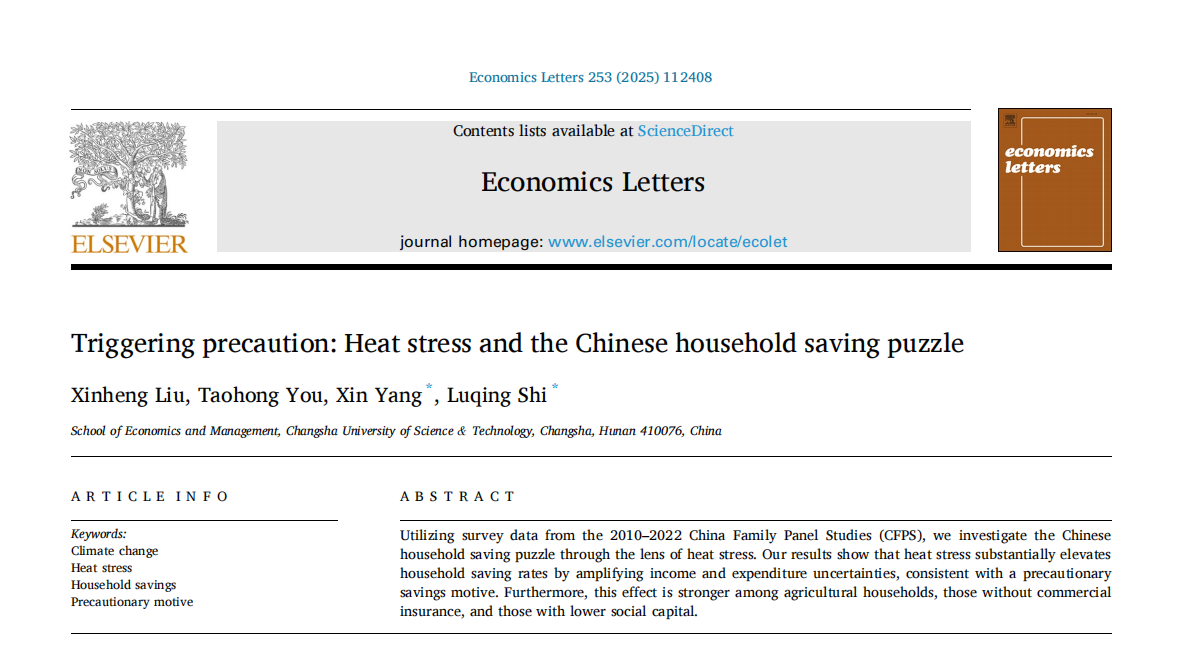 近日,由我院教师刘新恒博士为第一作者,与学院23级金融硕士游涛红、杨鑫副教授、24级工商管理学博士生石璐青合作完成的论文“Triggering precaution: Heat stress and the Chinese household saving puzzle”(探索热压力对中国家庭储蓄率的影响)在国际知名学术期刊《Economics Letters》(经济学快报)(2025, Volume 253)刊发,论文第一署名单位为LETOU体育平台,该文的数字对象标识码(DOI):10.1016/j.econlet.2025.112408。
