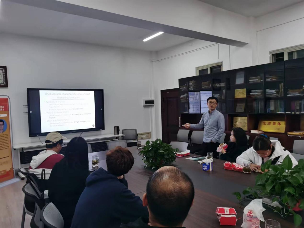 朱博士为大家作了主题为《Choosing Friends》的讲座,通过其田野实验研究发现,在多次重复的欺骗行为实验中,被试者所报告的实验结果分布显著偏离了预期概率分布。同时,个体网及整体网层面的证据都显示,现实社会关系网络中存在基于道德价值的同质性,且老年人群体样本的选择较为巧妙的排除了同侪效应的影响。随后,各位教师分别就该主题的样本选择、实验设计及拓展研究空间等方面进行了热烈的交流讨论。最后,副院长(主持工作)彭新宇就青年教师沙龙的开展形式、科研论文的写作与本科教学的科教融合相长等话题同与会教师做了深入的探讨。