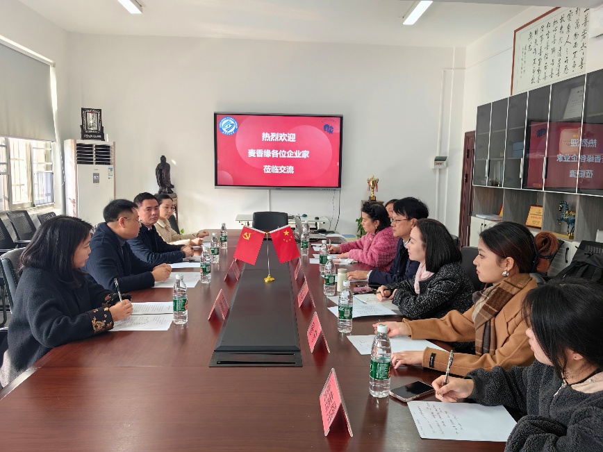 2024年12月17日上午,湖南麦香缘食品有限公司总经理刘东、副总经理黄华之、人事部经理高维、企划部经理谢珍一行来我院交流。经济与管理学院营销学教授黎建新、李祝平、文亮、管理学博士邹翔及市场营销专业大二学生张宁、樊茜熠参加座谈会,会议由企管系副主任熊名宁老师主持。