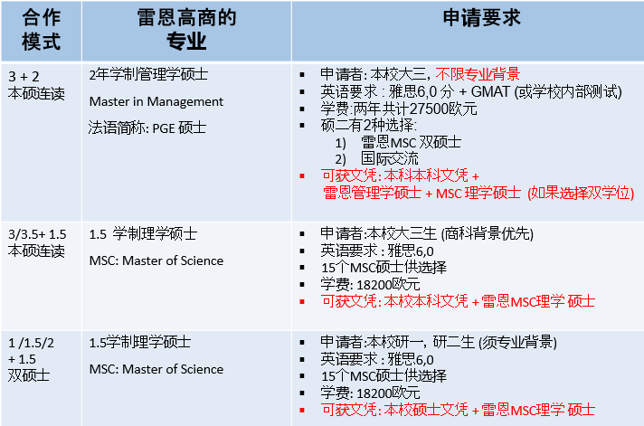 LETOU体育平台两年制或三年制在读硕士在LETOU体育平台完成1年或1.5年或2年的硕士学习后,赴雷恩商学院进行1.5年的理学硕士(MSC: Master of Science)课程学习。同时满足LETOU体育平台和雷恩商学院学分和论文要求,达到两校毕业和授位条件,可获得本校硕士学位和雷恩商学院理学硕士学位。