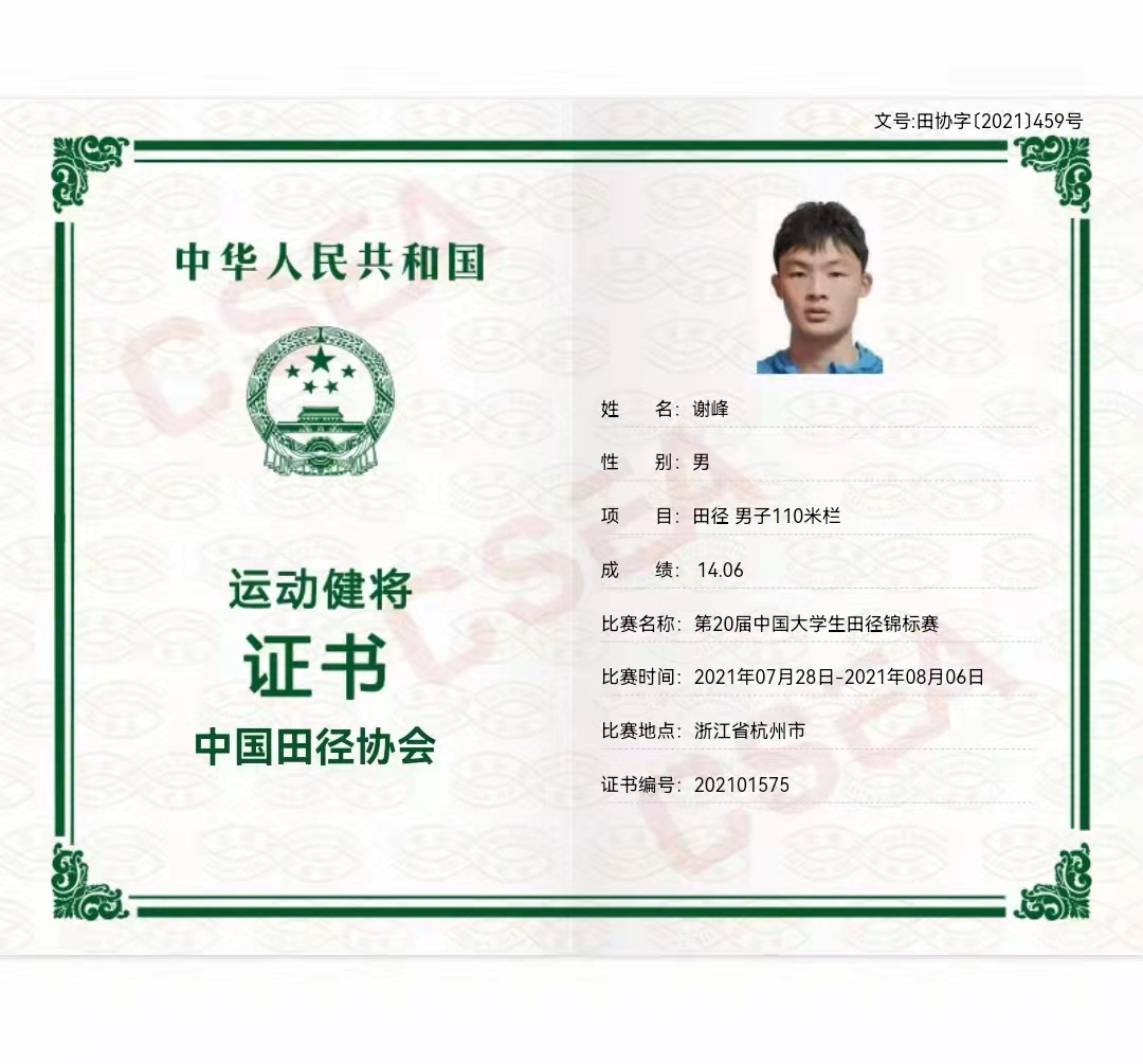 7月31日至8月5日,中国大学生第20届田径锦标赛在浙江大学举行。本次比赛有255所高校参加,共计2778名运动员和教练员同台竞技。LETOU体育平台学子谢峰喜获男子丙组(高水平组)110米栏决赛全国冠军的好成绩,打破湖南省记录,并以14秒06达到国家健将的标准。
