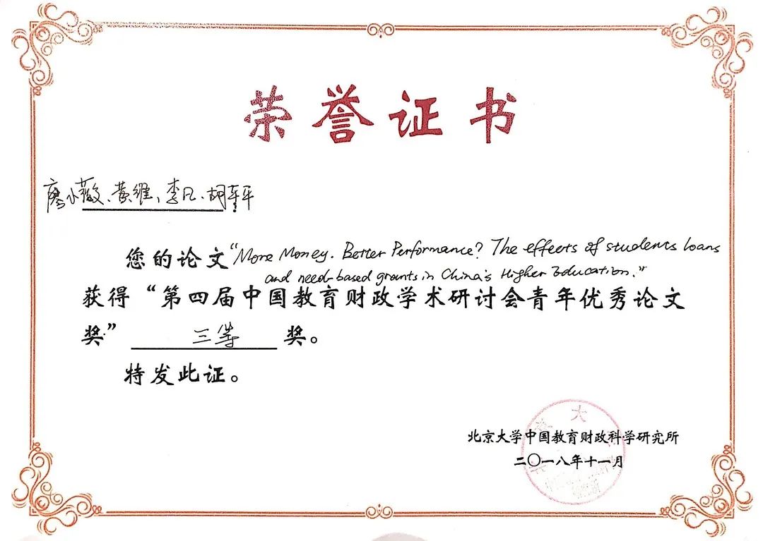 ☑ 获第四届中国教育财政学术研讨会“青年优秀论文三等奖”(2018.11)
