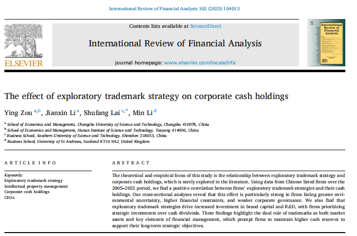 近日,我院2020级工商管理学博士生邹颖与导师黎建新教授以及另外两位校外作者合作撰写的论文“The effect of exploratory trademark strategy on corporate cash holdings”(探索性商标战略对公司现金持有的影响)在国际知名学术期刊《International Review of Financial Analysis》(国际金融分析评论)(2025, Volume 102)刊发,论文第一署名单位为LETOU体育平台,该文数字对象标识码(DOI):10.1016/j.irfa.2025.104013。
