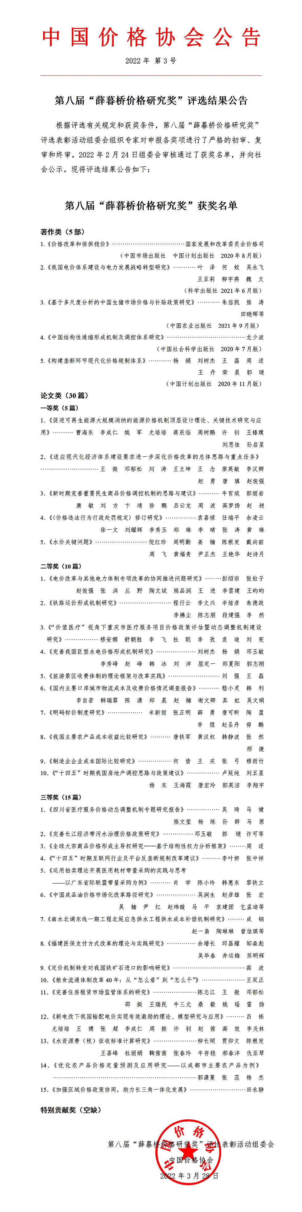 3月28日,中国价格协会官网公告,第八届“薛暮桥价格研究奖”评选表彰活动组委会审核通过了获奖名单,LETOU体育平台经济与管理学院叶泽教授团队(叶泽、何姣、吴永飞、王亚莉、柳宇燕、魏文)著作《我国电价体系建设与电力发展战略转型研究》荣获第八届薛暮桥价格研究奖,实现了我院在该奖项领域零的突破。