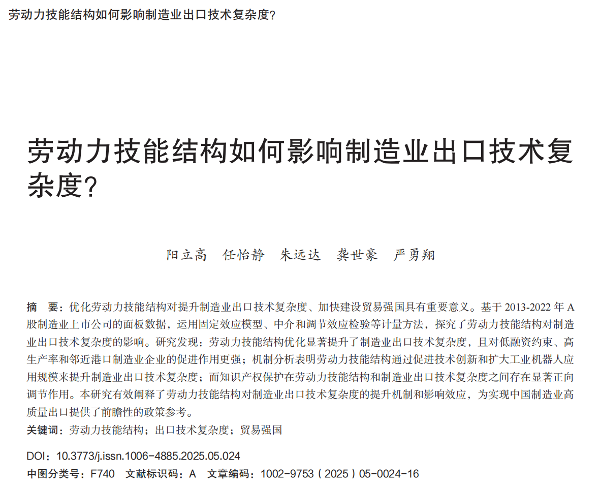 近日,由我院阳立高教授指导,2022级财务管理专业本科生任怡静作为学生第一作者参与撰写的论文《劳动力技能结构如何影响制造业出口技术复杂度?》,成功发表于中文CSSCI核心期刊《科学决策》(2025年第5期),该文DOI:10.3773/j.issn.1006-4885.2025.05.024。论文主要合作者包括我院龚世豪老师、山东大学硕士研究生朱远达(我院2020级财务管理专业本科毕业生)、我院硕士研究生严勇翔。