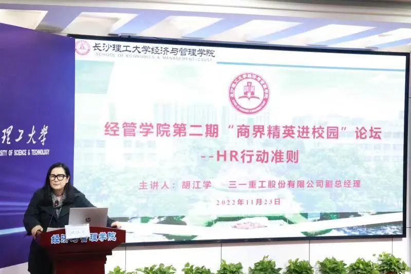 11月23日晚上19:00,经管学院在金盆岭校区12教200会议室举办了第二期“商界精英进校园”论坛。主讲人是三一重工股份有限公司副总经理、人力资源总部副总监兼三一工学院校长、执行理事长、湖南省人力资源学会副会长胡江学副教授,经管学院副院长彭新宇、副书记唐青、企管系副主任李铁宁、MBA中心主任扶缚龙、辅导员吴畏等教师代表、研究生、本科生200余人参加了本次讲座。本次讲座由我院胡宁教授主持。
