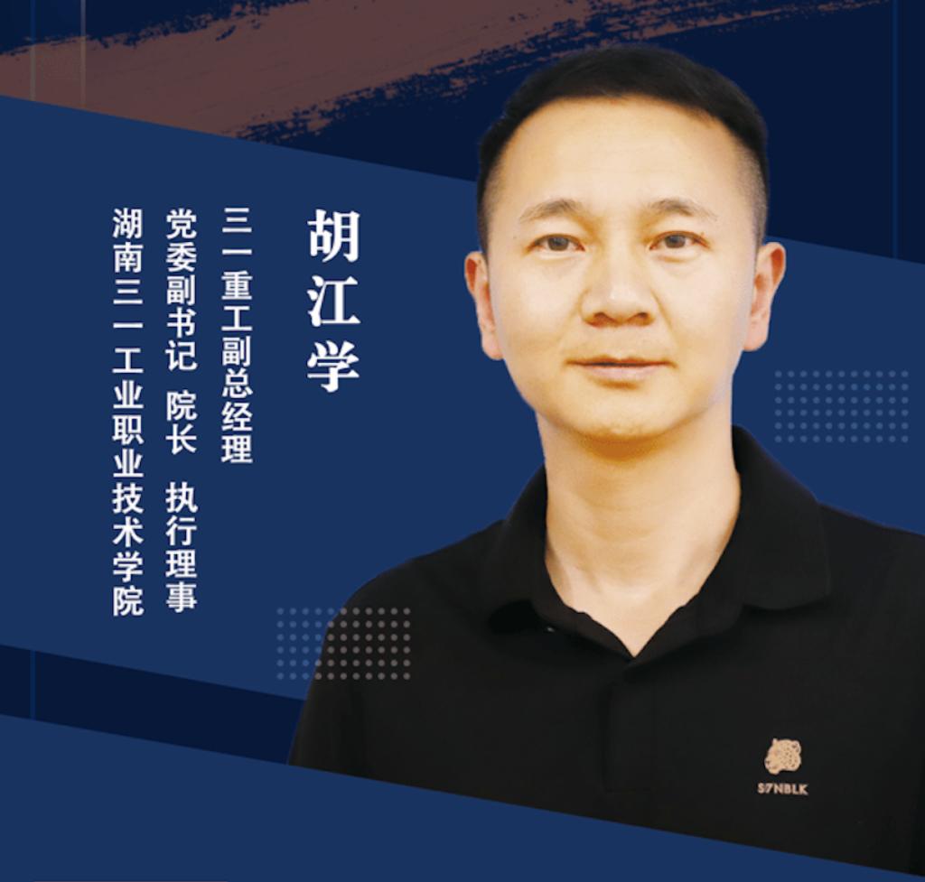 胡江学,副教授,现任三一集团人力资源总部副本监,三一重工副总经理,湖南三一工业职业技术学院党委副书记、院长、执行理事。