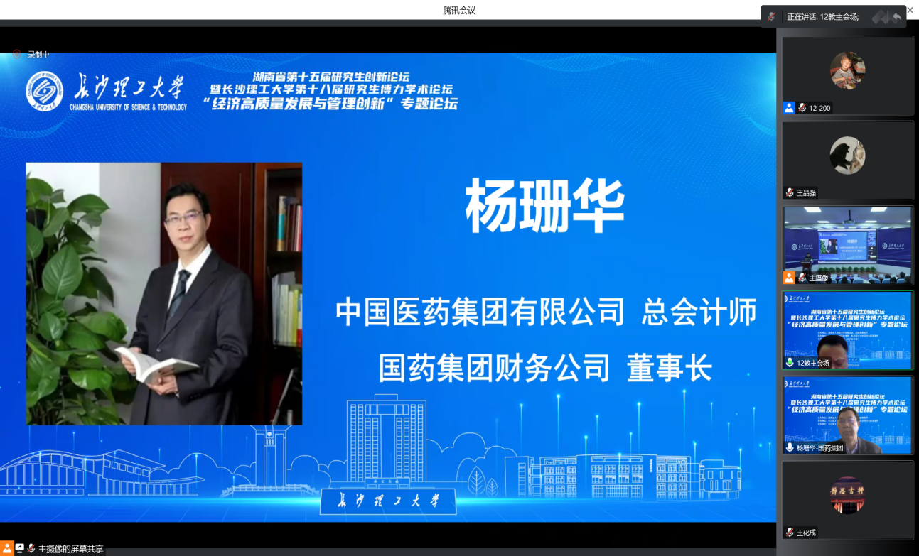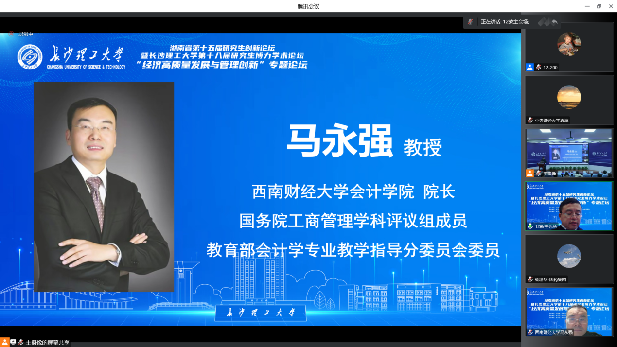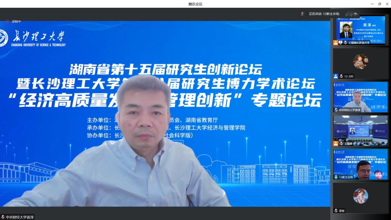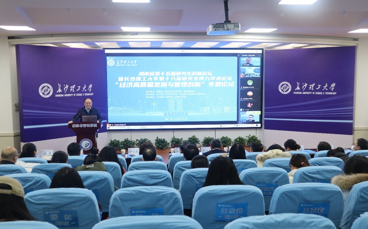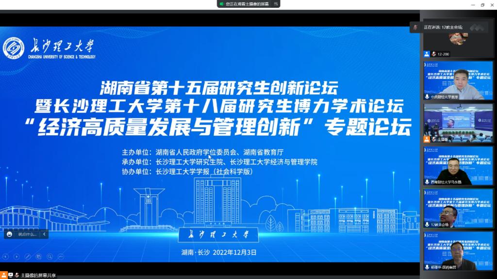 12月3日,湖南省第十五届研究生创新论坛——“经济高质量发展与管理创新”专题论坛暨LETOU体育平台第十八届研究生博力学术论坛在LETOU体育平台金盆岭校区成功举办。此次论坛由湖南省人民政府学位委员会、湖南省教育厅主办,LETOU体育平台研究生院、LETOU体育平台经管学院承办,LETOU体育平台学报(社会科学版)协办,采用线上线下相结合的方式。论坛邀请了中国人民大学商学院王化成教授、中国医药集团有限公司杨珊华总会计师、西南财经大学会计学院院长马永强教授、中央财经大学学术期刊社社长袁淳教授进行主题报告,LETOU体育平台副校长胡永乐教授、研究生院院长杨华峰教授、城南学院院长赵华教授、研究生院副院长尹筑嘉教授、LETOU体育平台学报(社会科学版)常务副主编邓英副教授、经管学院全体院领导、研究生导师以及省内高校300余名研究生参加了此次论坛。