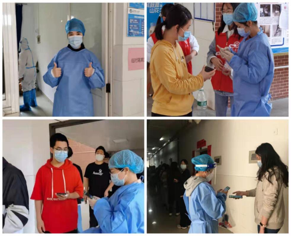 新入职党员陈洁说,“穿上蓝色防护服,戴上白色橡胶手套和蓝色防护帽的这一刻我才感受到防疫志愿者应有的担当。我决心一定要做好医生的左右手,做到全神贯注,和时间赛跑,不拖队伍的后腿。我一边撕着拭子,一边注意医生手上的动作,等做完一个学生之后,马上上前给医生的手上喷洒酒精,做到“一测一消”,然后再给医生递上准备好的拭子。当学生礼貌的说一句“辛苦了,谢谢。”,这一瞬间我觉得很温暖,所有的辛苦都觉得释然了。”
