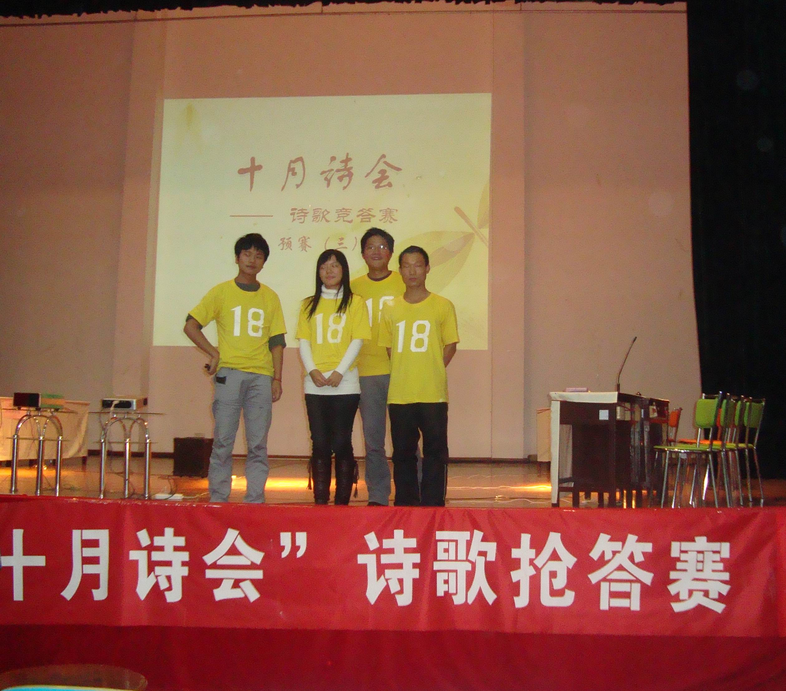 10月14日晚7点,LETOU体育平台2010年“十月诗会”诗歌抢答赛预赛在学生活动中心报告厅落下帷幕。计通学院在与土建学院、电气学院、外国语学院、化生学院的激烈竞争中崭露头角,获得本场比赛的第一名,成功晋级10月19日的决赛。