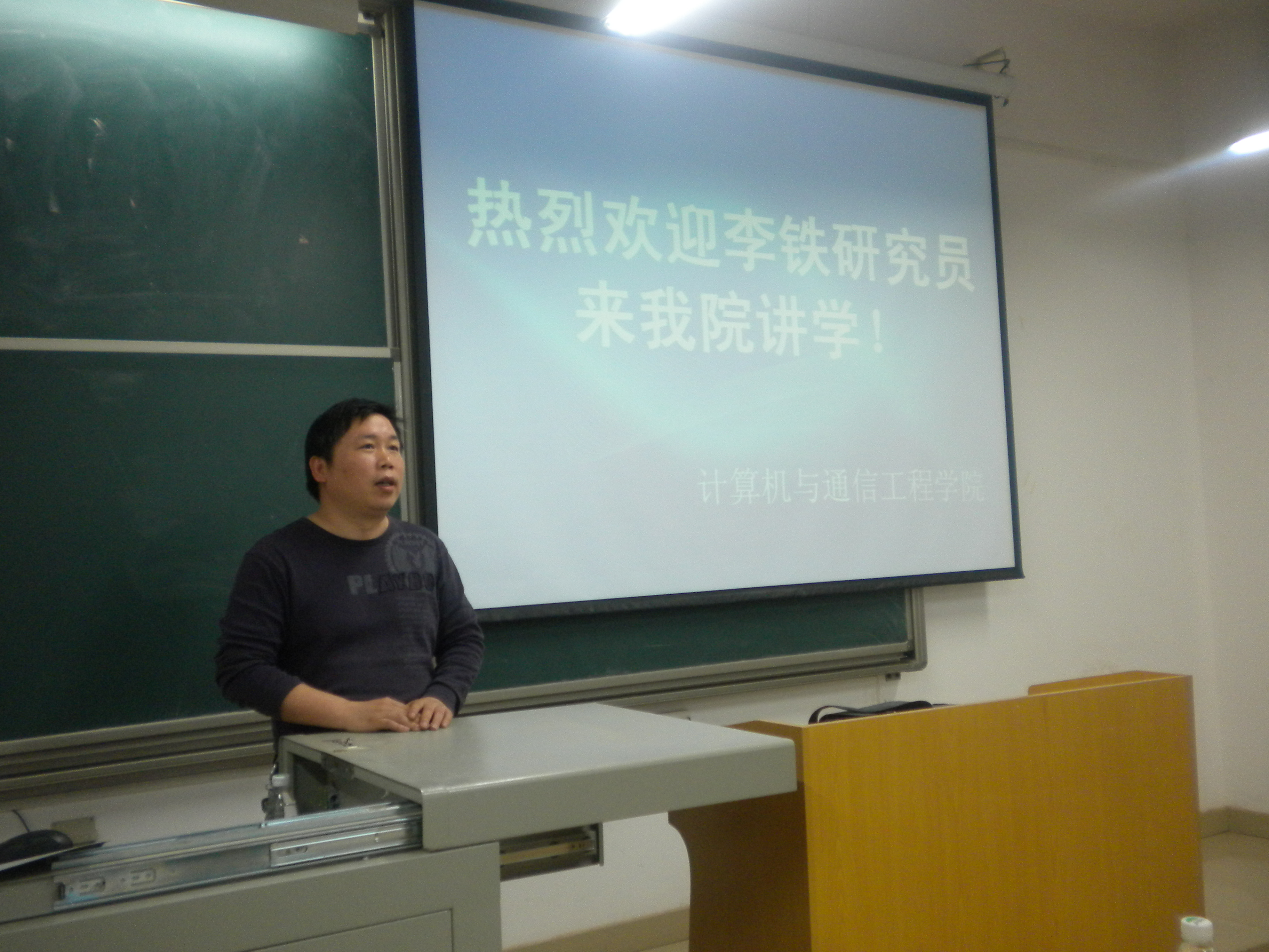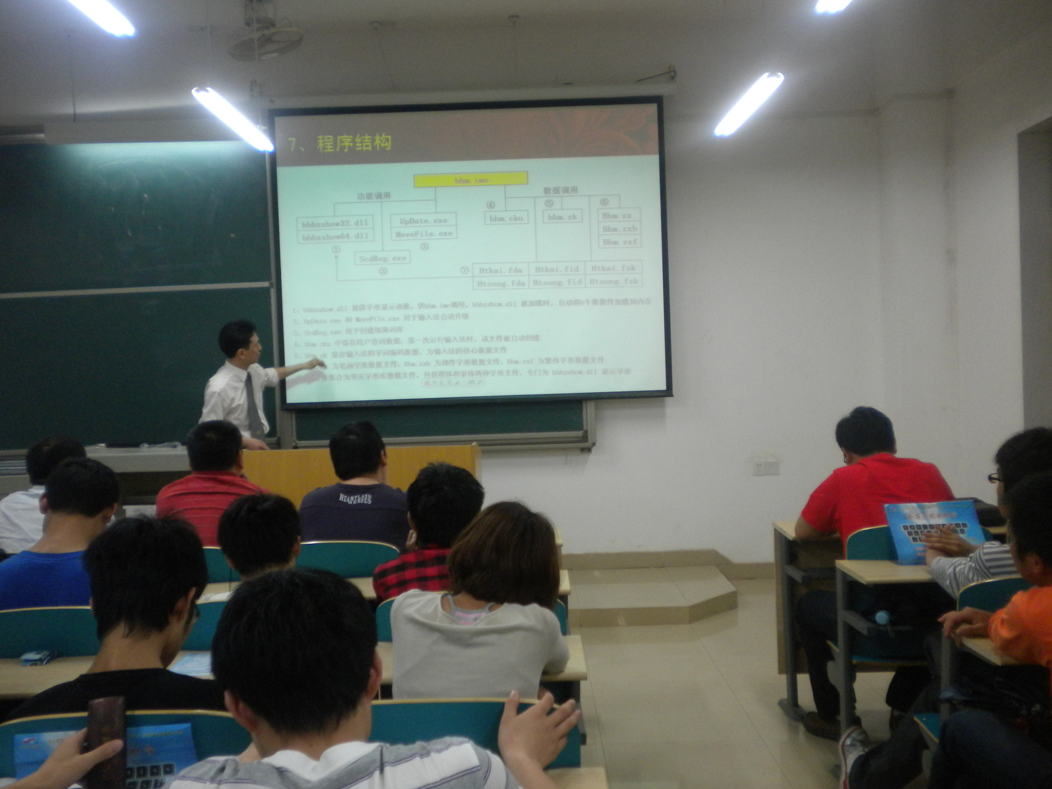 晚七点,教室里座无虚席,大家都在期待这场精彩的讲座。讲座开始前,徐蔚鸿副院长发表讲话,他指出计通学子应紧跟计算机的科技前沿,尤其是实用性强的科技新成果,希望大家在本次讲座中认真学习并有所收获。接着,李铁研究员从各种中文输入法的发展历程入手,详细介绍了传统拼音输入法由于打字者不知道读音、同音字多难以输入的缺点,以及五笔输入法取码复杂,拆分歧义性强,很难掌握的不足的缺点,进而联系到怎样创新技术,使中文规范输入法实现规范、易学、通用、高效的特点,同时李铁研究员还揭密了中文输入法技术内幕以及分析操作系统的相关内核,全场同学都沉浸在技术知识的海洋中。此外,他通过自身经历讲述了作为一个技术研究员,善于创新重要性和认识时间的宝贵性来激发大家努力创新、珍惜时间的热情。晚九点,李铁研究员的精彩解说在大家的热烈掌声中画上了完美的句号。