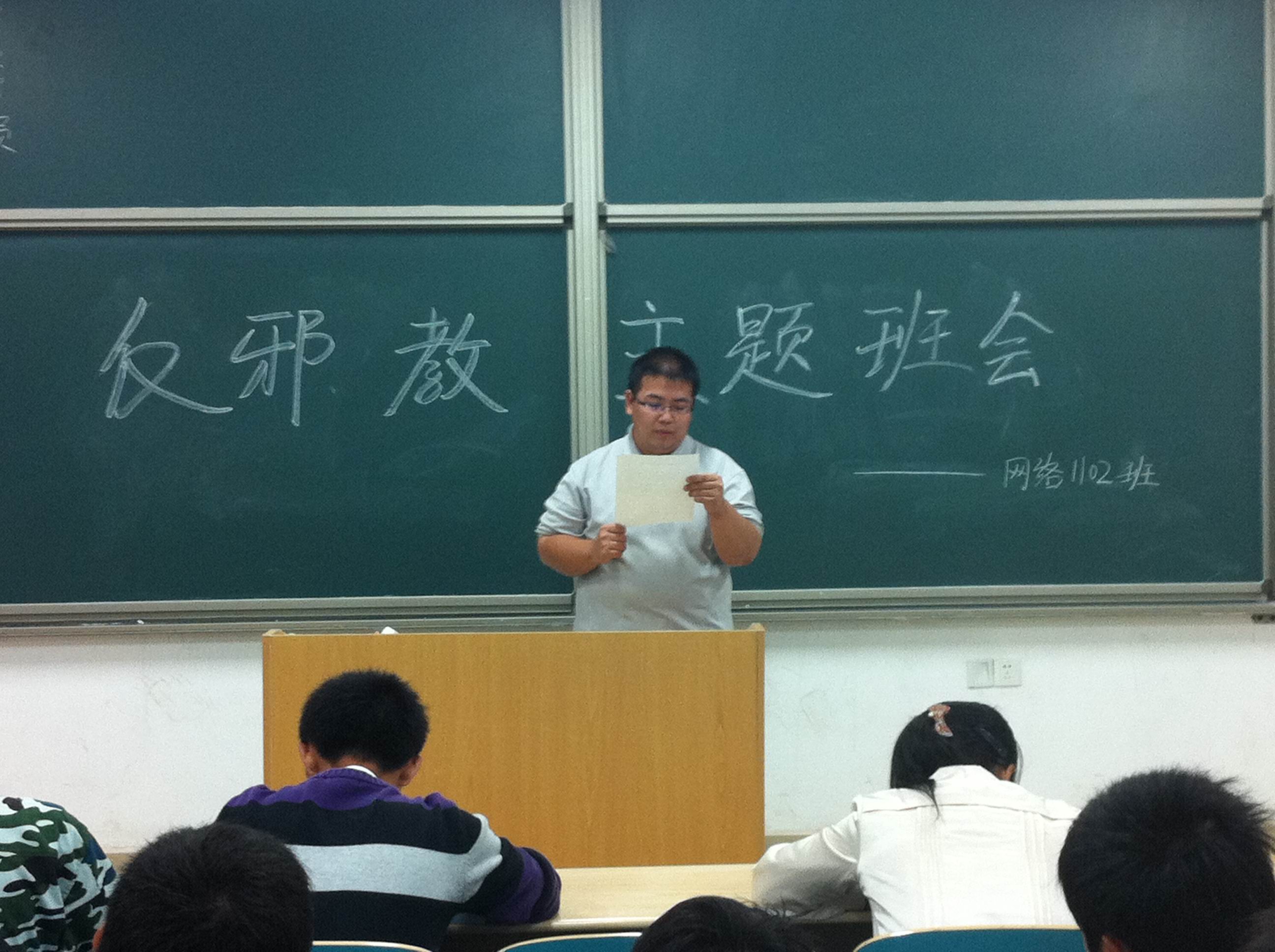 为了提高全体新生的安全法纪意识,引导同学们正确认识邪教的危害、积极反对邪教,9月18日晚,计通学院2011级10个班在辅导员禹敏老师、下班党员和下班干部的组织下开展了一次以反邪教为主题的班会。