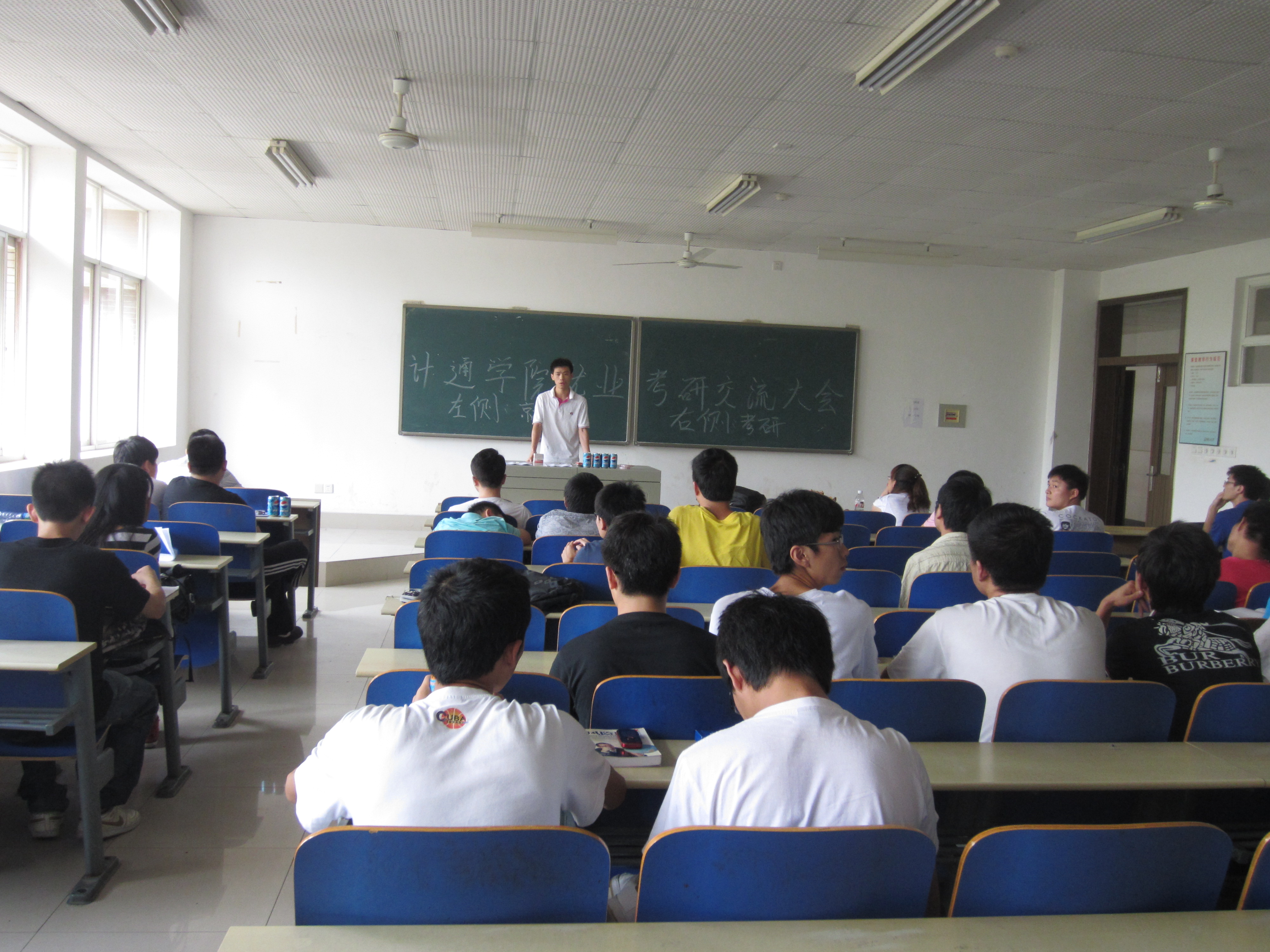 为使学生了解更多的考研信息和就业经验,明确学习方向,提高学习效率, 6月19日下午,计通学院邀请付希傲,黄超等4名2012届优秀毕业生与低年级同学在综教C204进行了考研就业交流会。