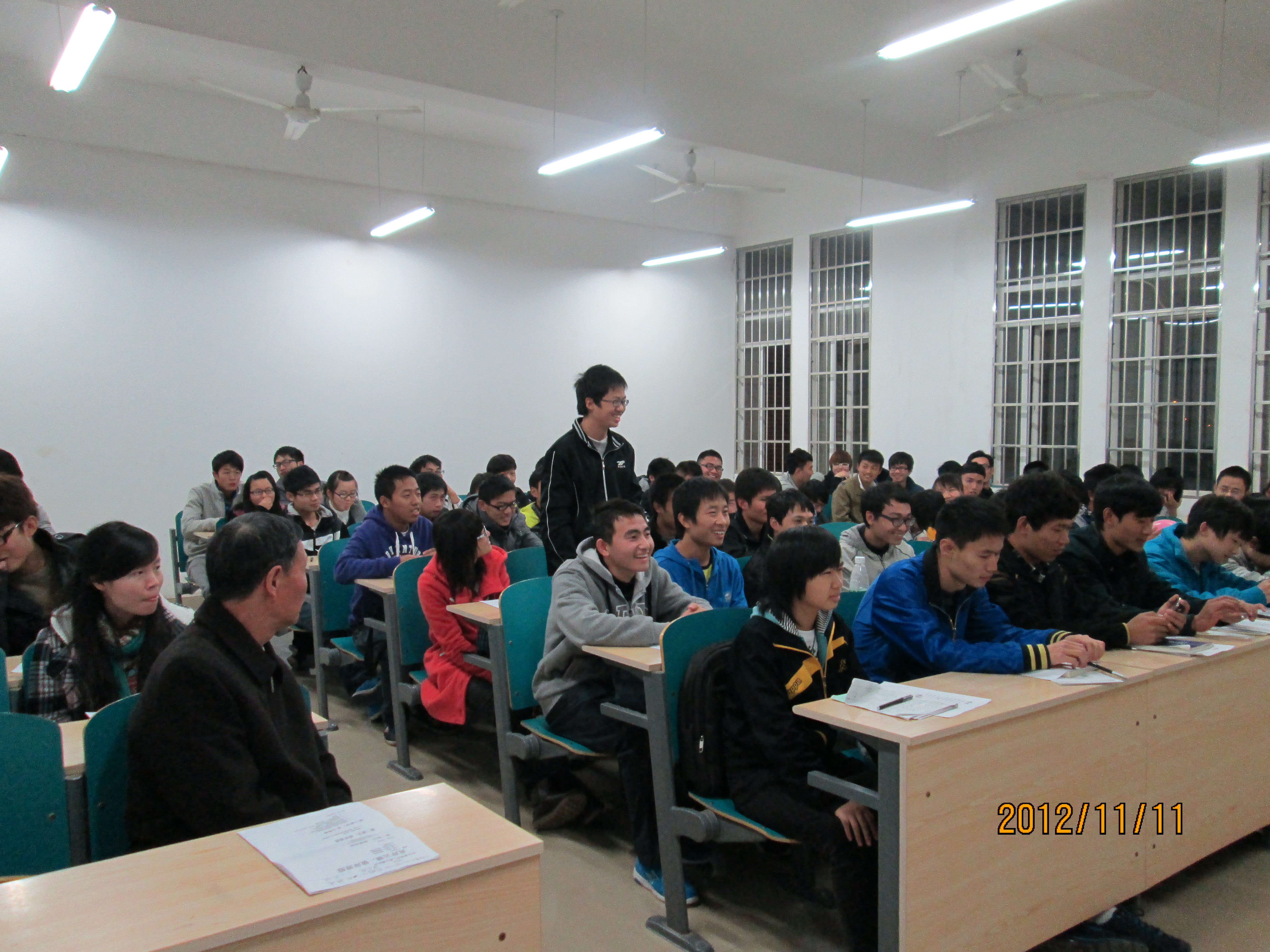 11月11日,计算机与通信工程学院2012级软件工程专业在理科楼B123召开了大学生“人生理想”主题教育班会。与会的来宾有:LETOU体育平台关心下一代委员会副主席雷理成老师,软件工程1201班班主任邓泽林老师,软件工程1202班班主任罗元盛老师,计算机与通信工程学院2012级辅导员张智敏老师。2012级软件工程专业全体同学、下班党员魏靖、郭鹏飞,下班干部黄林康以及其他专业各班代表参加班会。