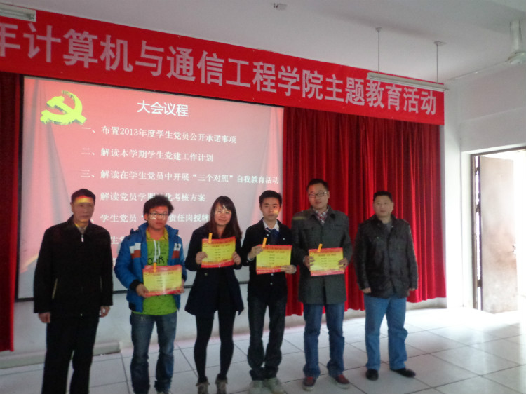 任志祥老师详细解读了2013年度学生党建工作计划和学生党员公开承诺等相关事项,要求进一步强化学生党员意识,深入学习党的十八大精神,本学期将召开学生党员“述先”大会,建立健全覆盖所有党员的考核制度,规范党员管理,并加强对党员和入党积极分子的再教育,要求全体学生党员践行好政治承诺、作风承诺、学习承诺,大胆创新,并要求每个党员公开党员博客,将自己的承诺发布在博客上,接受老师和同学的监督。学院学生党务工作部部长谢清颖同学宣读了《关于在学生党员中展开“三个对照”的自我教育活动的通知》,副部长谢朝君同学为大家解读了《学生党员学期量化考核方案》,雷理成老师做了大会发言,他希望全体党员同志抓好落实十八大精神,带领其他同学为计通学院党建工作贡献力量。