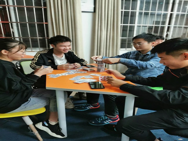 活动第二项由心理部组织开展了心理小游戏。以抽签的方式将在场的同学们分为七个小组。游戏共分为三轮——“比长”“比久”“建大厦”。第一、二轮游戏每组需派出一位成员参加,每位参与成员有一次向小组成员求助的机会。第三轮是团体游戏,每组一副扑克牌,看哪一组搭建的“大厦”又高又稳固。