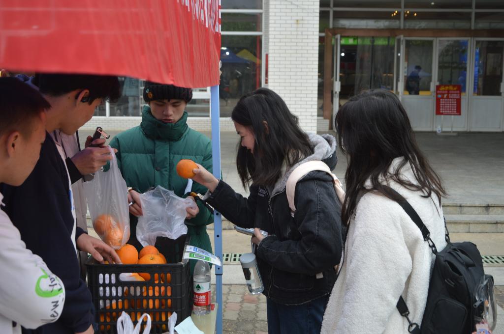 赛前,院团委学生会的同学们协助扶贫营销小队开展线上宣传等准备工作,为扶贫营销的顺利开展奠定了基础。在大家将一个个甘甜圆润、芬芳馥郁的脐橙运至摆点处后,一天的售卖正式开始。寒风阵阵,依然吹不冷扶贫营销小队售卖脐橙的热情,也抵挡不住同学们购买的积极性,许多领导、老师也亲临售卖现场,对扶贫营销小队的同学们进行支持与鼓励。最终,计通学院经过两天的售卖与推广,完成了总计销售量664斤的好成绩!