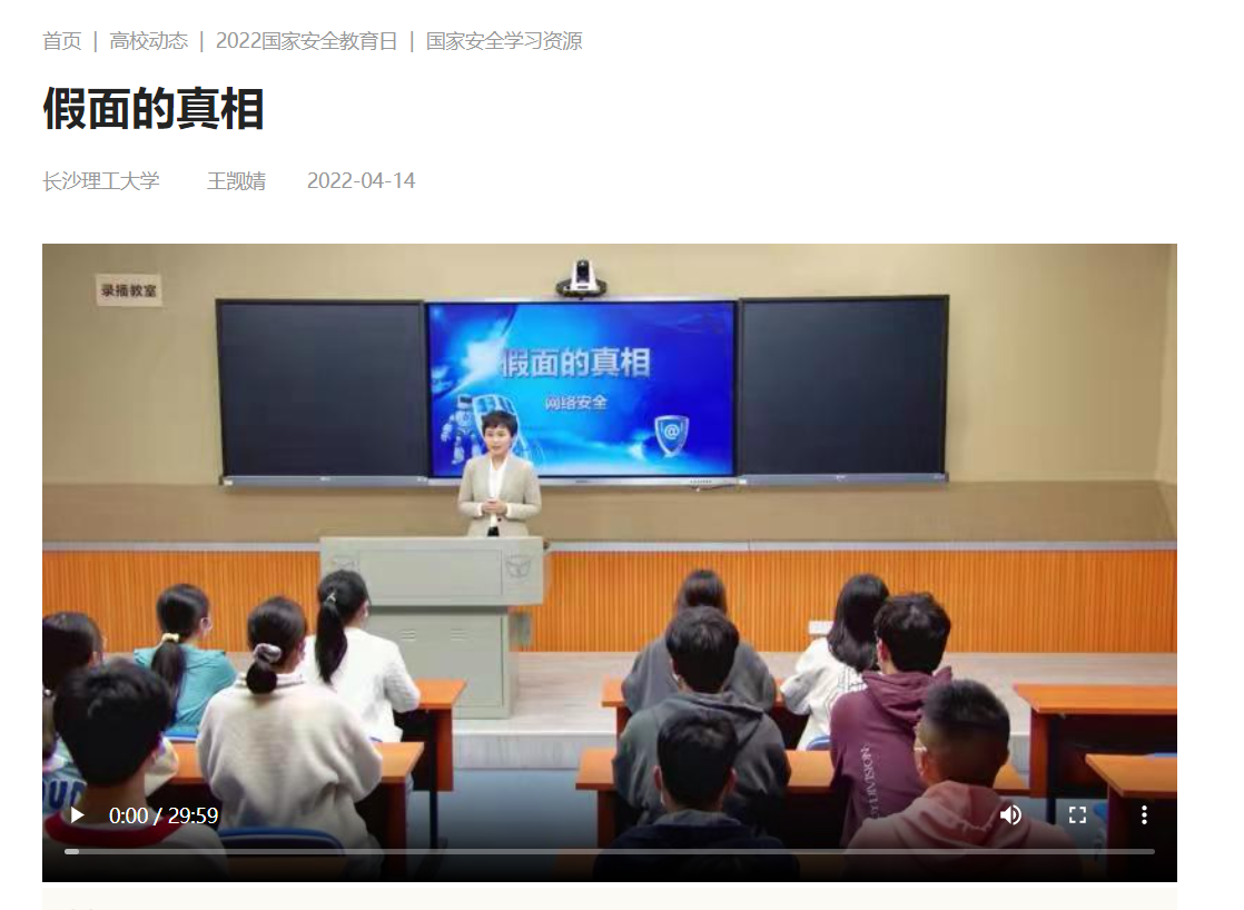 为贯彻落实《教育部思想政治工作司关于组织开展2022年全民国家安全教育日宣传教育活动的通知》,树牢国民安全意识,进一步推动国家安全观深入人心、落地生根,中国高等教育学会保卫学专业委员会、全国高校思想政治工作网、教育部高校思想政治工作创新发展中心联合举办2022年全国高校教师国家安全教育教学视频征集与展示活动,我院代理党委副书记王觊婧的课程《假面的真相》成功入选国家安全教育教学优秀视频展示,全国共8所高校的教学视频入选展播,湖南省仅LETOU官网一项。