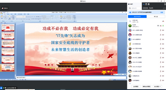 “功成不必在我,功成必定有我”。课程最后,孔伟红对此次党课做了小结,通过结合学校第四次党代会“123455”发展思路以及学院学科特色,对同学们提出了新的要求,她希望“IT先锋”们要矢志成为国家安全底线的守护者、未来智慧生活的创造者。