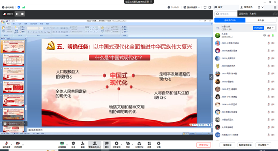随后,孔伟红就党过去五年的工作情况和新时代十年的历史成就和伟大变革进行了详细的阐述,从马克思主义中国化、时代化,中国特色社会主义现代化以及全面建设社会主义现代化国家的目标任务五方面为大家进行了党的二十大报告的全面导读,深刻阐明了新中国成立至今,中国共产党及党的领导核心一以贯之、持之以恒地为人民谋幸福,为民族谋复兴的伟大奋斗历程和取得的伟大成就,帮助同学们更加深刻地理解了党的二十大精神。