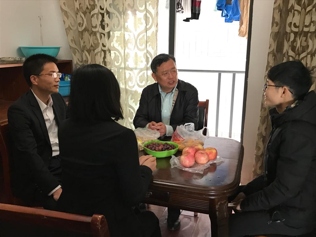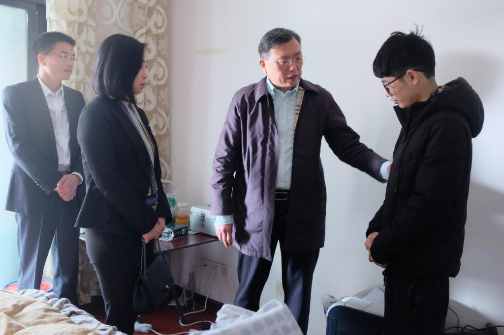 4月8日上午,副校长谈传生在校团委书记陈曦、计通学院党委书记方琼等一行人的陪同下看望了租住在长沙市四方坪的患病学生邹勇松。