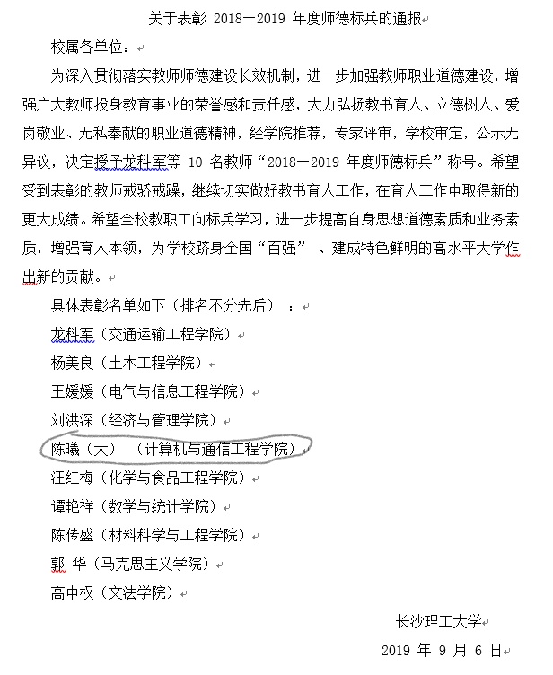 9月10日,第35个教师节来临之际,我院院长王进教授、计算机科学系党委书记陈曦教授在这个特殊的日子各自收获了一份特殊的礼物,分别入选2019年湖南省“芙蓉学者”推荐名单,获评2019年LETOU体育平台师德标兵,这份教师节礼物他们担得起!