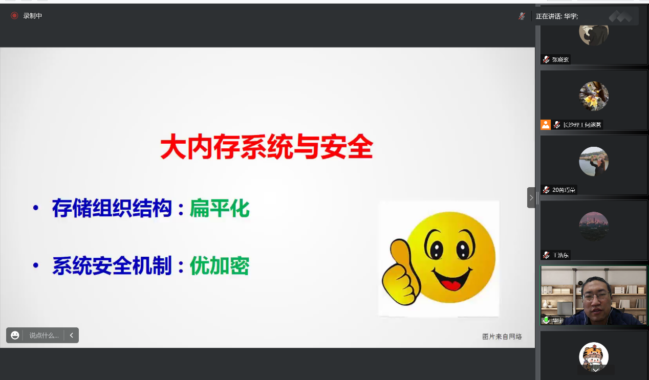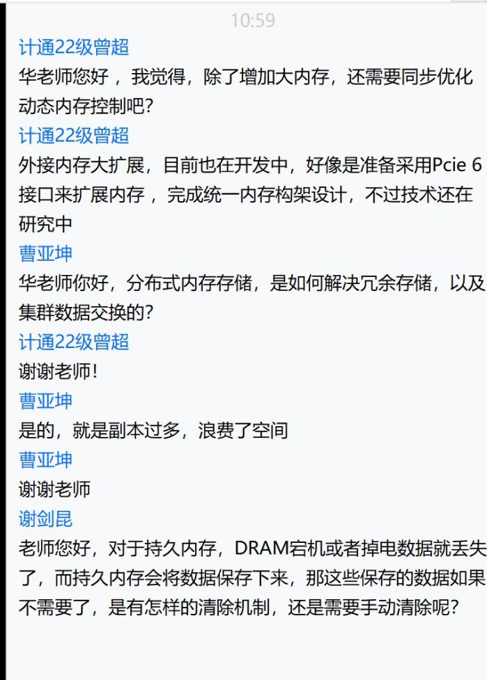 华宇教授以他多年来对大内存系统的研究与学习,围绕当前系统所使用的技术和所存在的一些问题,用严谨而又深刻的学术语言讲述了一堂课,使我们计通学子受益匪浅,并对大内存系统与安全产生了极大的兴趣。