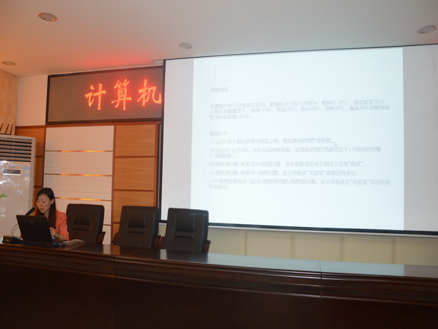 此次心理测试使用常用的SCL-90症状自评量表,由学院心理辅导员禹敏负责施测,我院近140名教师在规定时间内完成自评。随后,心理辅导员通过ppt展示了量表的计分方式和结果的解释,并对测量中涉及的10个因子进行了详细的介绍。