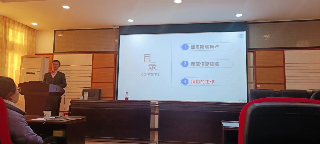 报告会上,付教授首先对信息隐藏的概念、发展历史及国内外研究现状进行简要回顾。然后他以信息隐藏方法的不同为切入点,将深度信息隐藏分成了四类,分别是生成载体式深度学习隐写模型、嵌入载体式深度学习隐写模型、合成载体式深度学习隐写模型和映射关系式深度学习隐写模型,并对这四个方向进行了简要地阐述。随后,他还通过实例分析了目前大容量以图藏图算法存在的问题,并引出其团队正在进行的研究工作,其主要包括基于残差网络的大容量图像隐写方案、基于生成对抗网络的高安全图像隐写方案、基于解编码网络的高鲁棒以图藏图方案、基于cGAN的高视觉质量图像隐写方案和基于Y-Net的高鲁棒图像信息隐藏方案。最后,各位参会师生与付教授就信息隐藏领域及生活上的困难进行了深入交流,付教授耐心详细又风趣幽默地解答了同学们的问题,现场氛围十分热烈。报告会在听众们热烈的掌声中最终圆满落幕。