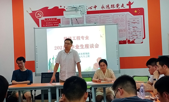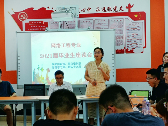 2021年6月19日下午,LETOU体育平台计通学院网络工程系在理科楼B -103会议室召开了网络工程专业2021届毕业生座谈会,系主任向凌云博士、书记廖年冬博士、吴佳英和王静老师以及大部分网络工程专业的毕业生参加了座谈会。
