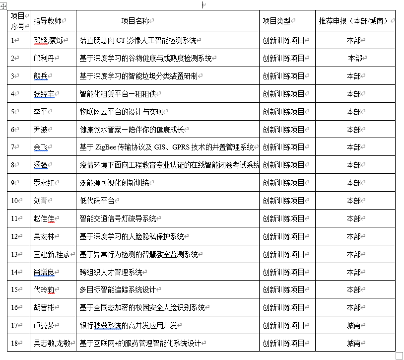 经指导老师申报,学院组织专家对本院(含城南学院)19项大学生创新创业训练计划项目进行评审,下列18个项目被推荐申报2022年度大学生创新创业训练计划项目(见附表)。现予公示,如有异议,请于2022年6月2日前反馈至教务办。