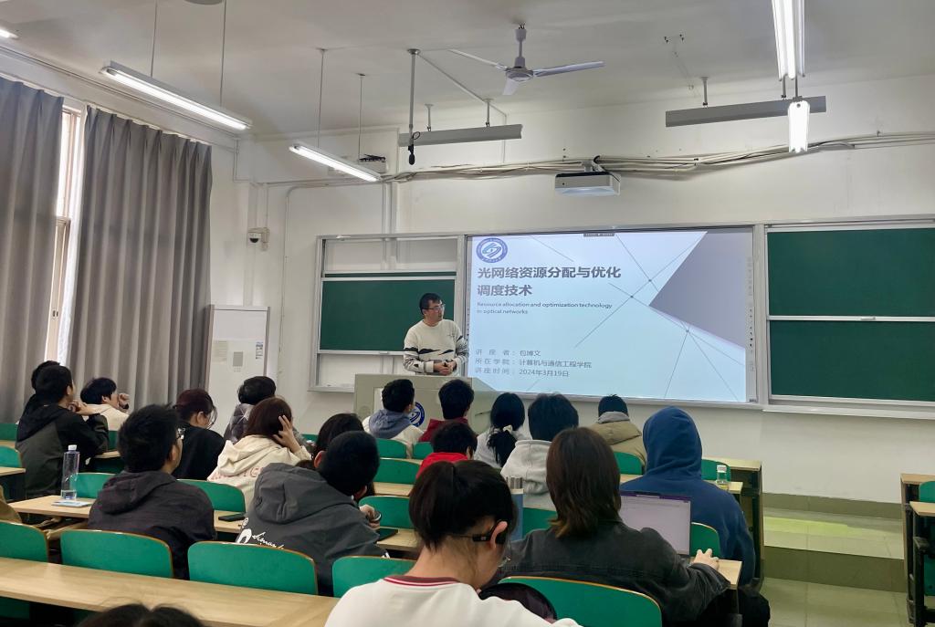 3月19日下午3点,计算机与通信工程学院包博文博士在金盆岭校区6教303为计算机与通信工程学院与部分外院的本科生做了题为“光网络资源分配与优化调度技术”的本科生通识讲座报告。