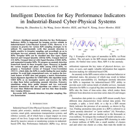 该论文“Intelligent Detection for Key Performance Indicators in Industrial-Based Cyber-Physical Systems”主要研究了不规则采样情况下的关键性能指标的异常检测算法。工业CPS系统中部署大量监控设备监控系统运行状态和性能,同时产生数以万计的关键性能指标(Key Performance Indicator,KPI)数据。然而,KPI数据容易有显着的形变(噪声、振幅、相移)。KPI数据采样的策略由运维人员根据实际情况设定(采样时段、采样间隔),因此不均匀、不规则、不等长的KPI数据普遍大量存在。大规模、时序、非均匀等这些特点使得规则KPI异常检测方法失效,而基于动态时间规整(Dynamic Time Warping, DTW)的计算复杂度大。本文提出了大规模不规则KPI的异常检测框架,该框架将不规则KPI分为四种类型,并针对这些不同类型的KPI设计了相应的异常检测方法。针对等间不等量KPI,我们提出了标准化不规则互相关距离作为距离度量,通过在不同的KPI之间进行滑动,寻找最相似的位置,来减少相移可能造成的影响。针对不等间KPI,我们直接通过DTW作为距离度量来对其进行异常检测。针对等时长不等间KPI,我们提出了一种基于矩阵填充的对齐算法,在矩阵填充之后进行异常检测,以避免高昂的计算成本。