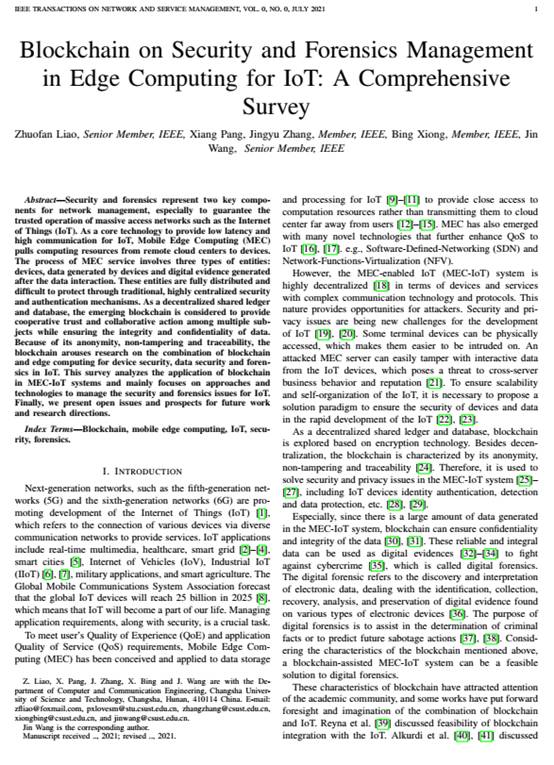 我院廖卓凡老师论文《Blockchain on Security and Forensics Management in Edge Computing for IoT: A Comprehensive Survey》被国际顶级期刊录用
