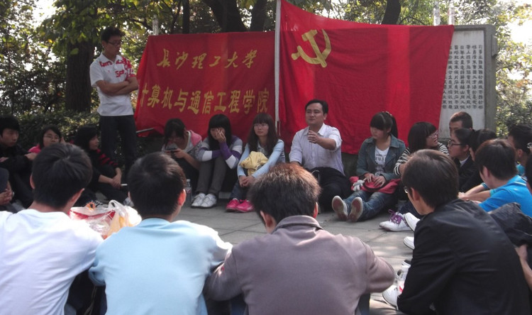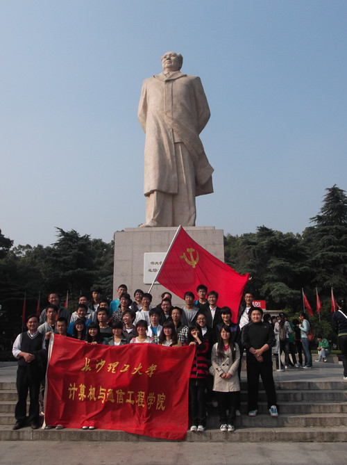早上8点半,学员们从云塘出发,10点到达东方红广场,全体学员在毛主席的雕像下合影留念。10点半左右,在伍接朝老师的带领下,活动负责人谭飞刚、佘灿、何克岩、席斌同学组织全体学员代表开始登山。一路上,LETOU体育平台计通学院的院旗和中国共产党的党旗在登往岳麓山的路上随风飘扬,形成了一道亮丽的风景线。尽管山路崎岖漫长,同学们却兴致勃勃,一路上有说有笑,非常热闹。经过将近40分钟的跋涉,全体学员代表到达黄兴墓前。在整理好队伍后,入党积极分子培训班班长席斌向同学们简单的介绍了黄兴的生平事迹,党校助理班主任谭飞刚同学带领全体学员代表高举拳头,在黄兴墓前,面对中国共产党党旗庄严宣誓。下午1点左右,伍老师组织学员们进行座谈,同学们在黄兴墓边席地而坐,围成一个圈,把零食当做午餐,一边吃着零食一边开始进行交流,来自学院本科生四个年级和研究生两个年级,计算机、通信、网络和软件四个专业的入党积极分子以及预备党员们在此刻就像亲密的一家人。伍老师向大家说明了此次来岳麓山的意义,简要的介绍了辛亥革命的和中国共产党历史,并带领大家学唱《国际歌》。在伍老师的带动下,同学们纷纷上场表演节目,交流活动一直进行到下午3点。