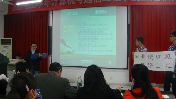 本次评选大会共有三个年级11个团支部及推选到校五四红旗团支部的软件1101团支部参加了PPT答辩。12个团支部分别从思想建设,学风建设,活动开展,获奖情及未来展望等多方面多角度对团支部的特色及风采进行了充分的展示,每个团支部展示结束后,评委老师都针对支部建设情况进行了提问。团支部成员精彩的展示与机智的问答赢得了观众及评委的阵阵掌声。