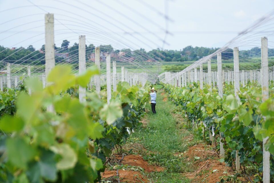 多日连续暴雨后,天空一碧如洗,实践团成员们一路欢歌抵达葡萄种植基地。据秦会长介绍,整个种植园有207亩田地,园里的葡萄品种(夏黑和巨峰)即将收获。秦会长抓起一把夏黑葡萄给志愿者们品尝,果然名不虚传。站在葡萄园观赏区,一望无际的葡萄园基地,大家发现,每行每列的葡萄架都是笔直的一条线,这不仅有利于果农进行浇水灌溉。同时也是当地葡萄种植的一大特色。