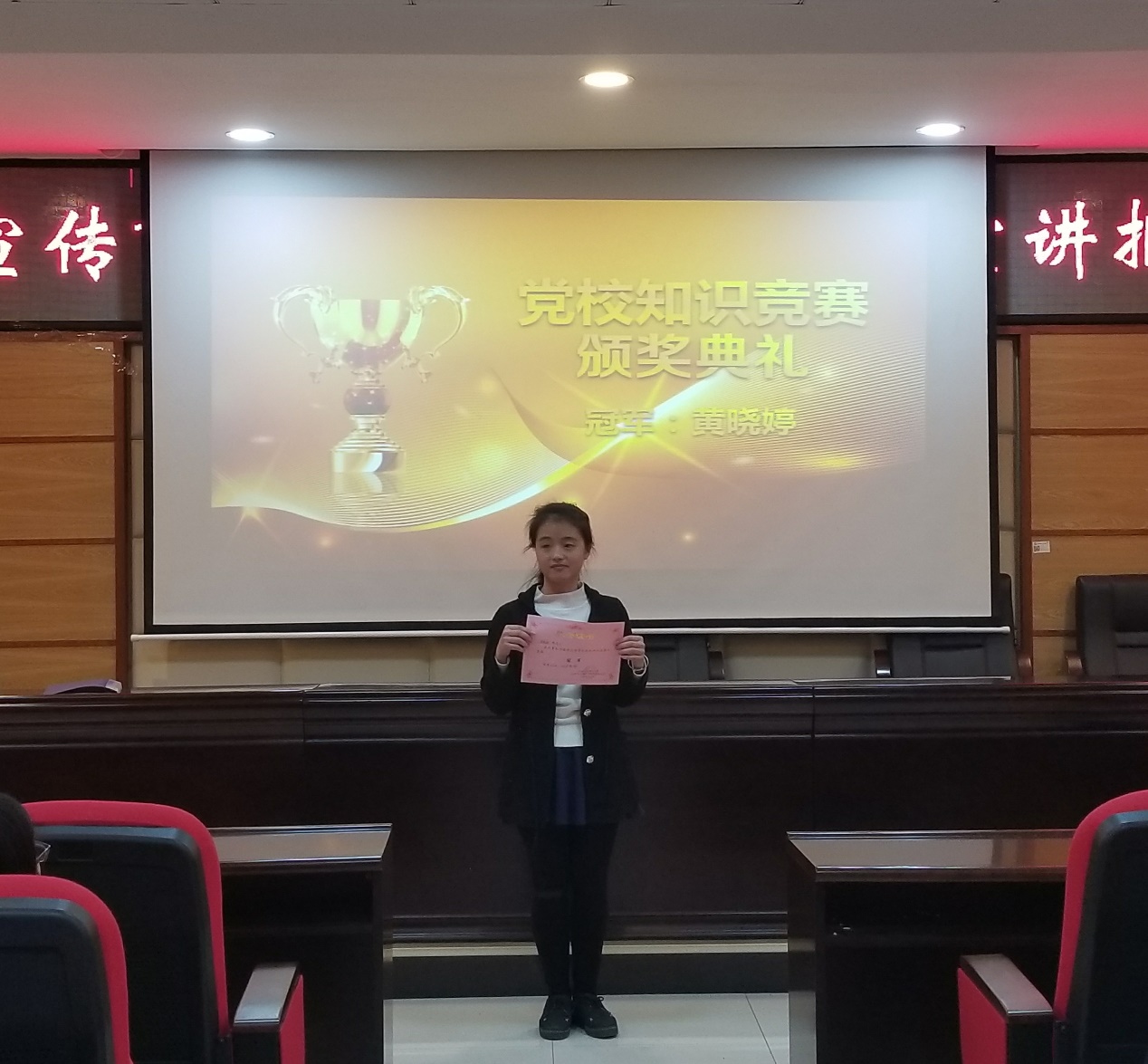 竞赛在紧张而又活泼的气氛中推向高潮。百人大战仅剩的七人进入到了第二环节——“巅峰对决”。此环节为快速笔试,七名选手移步台前,在全场监督下进行选择题的作答,每题答题时间为10秒,十道题过后,主持人收取7名选手的答题纸,由各支部负责人现场阅卷并评分。评分过后,张晓成功夺得发展对象组第一名,入党积极分子因俩人答对题数相同,进行了一轮加试,最后,黄晓婷胜出,夺得入党积极分子组第一名。