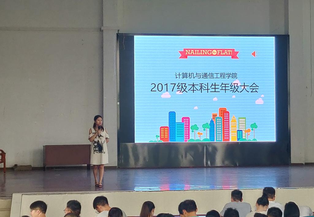 新学期新征程,为了更好的开展本学期的工作,9月10日,计算机与通信工程学院在学生活动中心大学生科技报告厅举行2017级本科生年级大会,本次会议由17级年纪辅导员潘枝花老师主持。