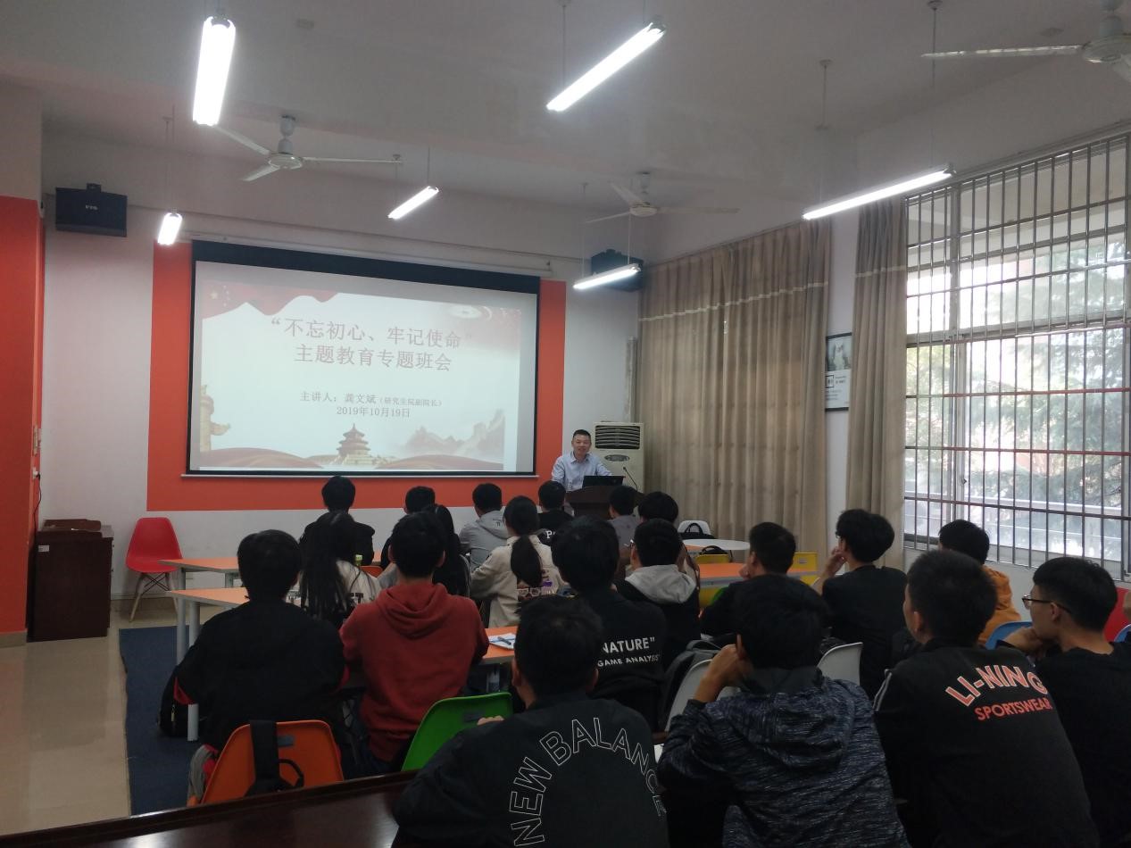 为进一步落实立德树人的根本任务,坚持用习近平新时代中国特色社会主义思想武装学生,擦亮青年学生的政治底色, 10月18日-22日,副校长蒋昌波、宣传部部长方琼、创新创业教育学院蒋加伏、研究生院副院长龚文斌等9位处级以上领导干部为各自所联系的班级进行“不忘初心、牢记使命”主题教育导学。
