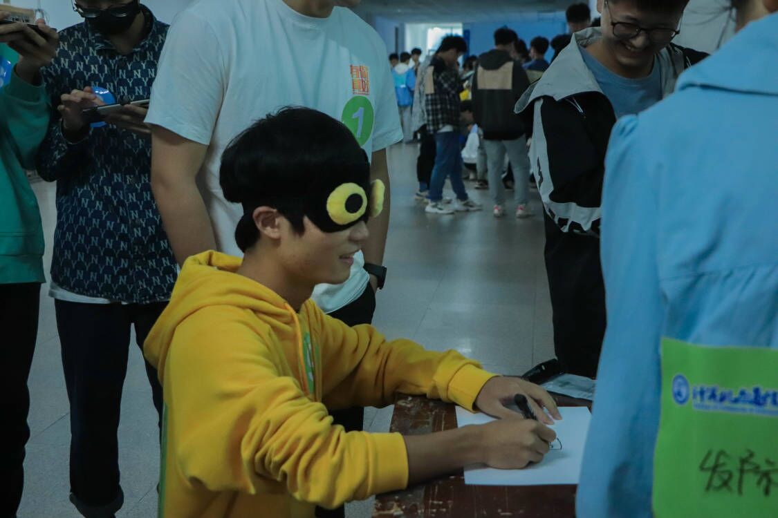 活动开始前,各队队长在专属于本队的彩色贴纸上写下队名,粘贴在衣服背后,并在胸前贴上表示队号的胸贴。接着,心理工作组成员介绍了游戏规则和积分方式。本次素质拓展活动有四个游戏同时进行,同学们可以自由选择顺序依次进行。