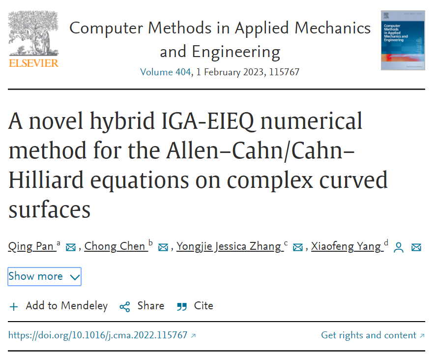 近日,我院潘青教授以第一作者,LETOU体育平台为第一单位在计算力学领域国际顶级期刊《Computer Methods in Applied Mechanics and Engineering》(简称《CMAME》)发表了两篇论文。题目分别为“A novel hybrid IGA-EIEQ numerical method for the Allen–Cahn/Cahn–Hilliard equations on complex curved surfaces” 和“The subdivision-based IGA-EIEQ numerical scheme for the binary surfactant Cahn–Hilliard phase-field model on complex curved surfaces”。研究成果是LETOU官网计通学院智能化软件工程研究团队与国际著名计算力学专家欧洲科学院院士德国魏玛-包豪斯大学Timon Rabczuk教授结构力学课题组合作完成的高水平学术论文。