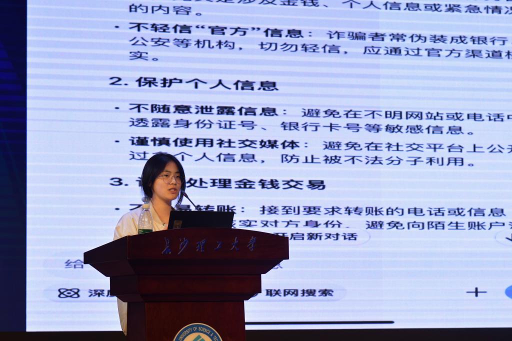 活动现场开展“你问我答”互动环节,同学们踊跃参与防诈知识竞答,现场气氛热烈。此外,讲座创新设置受骗学生宣讲环节,亲历者现身说理,完整还原电诈实例,使朋辈教育的力量具象化,成为可感知的防御策略。