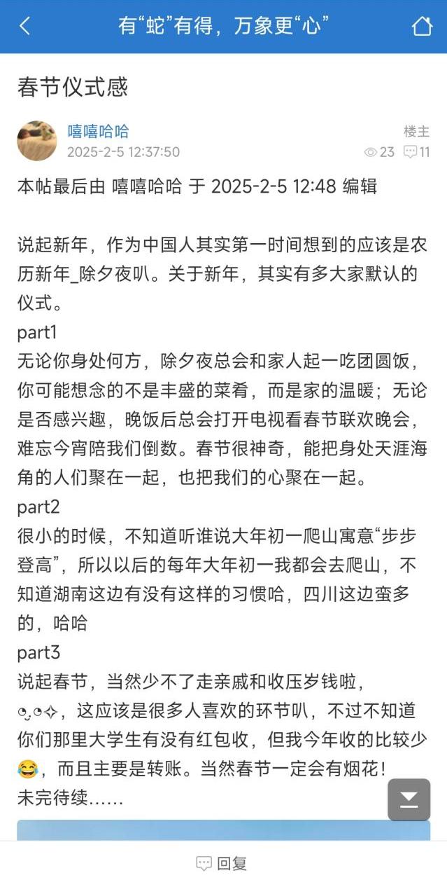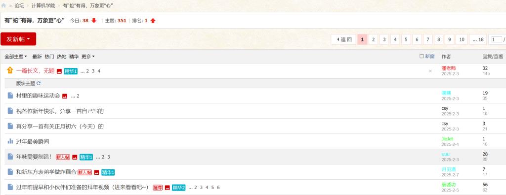 活动开展不到十天,便已有300余个主题、2000余篇帖子发布,论坛设置了系统加分奖励制度,并筛选优质帖子设置为“精华”帖,根据论坛发帖及互动情况,表现优秀的会被识别标记“荣誉成就”。同学们踊跃参加,有传播新春祝福视频的,有晒鞭炮创意“福”字图的,有发文怀念亲人的,有分享全家福照片记录亲友聚会温馨时刻的......每一封帖子里都沉淀着同学们对生活的热爱、对岁月的感怀,表达了他们珍惜亲情、珍爱友情、热爱生活的人生态度。评论区的祝福更是弥漫着真诚和温情,让这个年有了别样“年味”,让IT人的在自己的“心”家园里走心、用心、交心、放心。