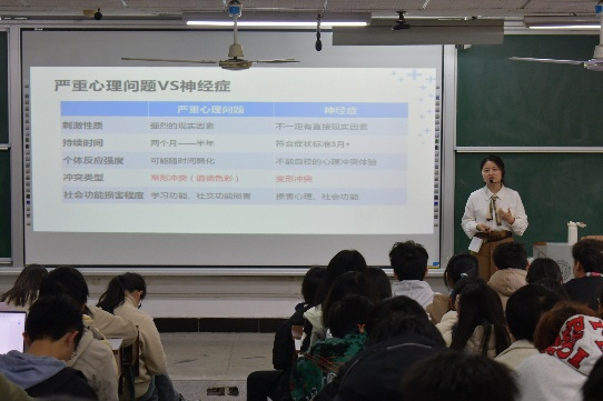 潘枝花老师从朋辈身份、职责、定位来详细解释了同学们可以发挥的作用,并介绍了学院、学校的心理健康教育活动,鼓励朋辈心理互助员动员广大同学积极参加有益身心发展的各类素质拓展活动。潘枝花老师结合实例,直观呈现抑郁障碍、焦虑谱系、双相情感障碍等常见心理问题的识别要点,强调对人际困扰、情绪失控等异常信号的敏锐觉察。通过揭示心理疾病的发生机制与康复路径,培养"早发现、早干预、早治疗"的协同意识。