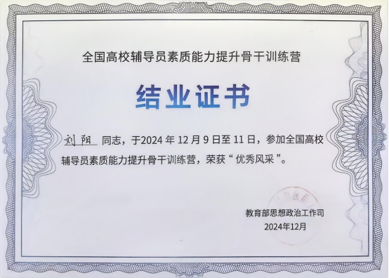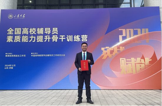 12月9日至12月11日,2024年全国高校辅导员素质能力提升骨干训练营在山东大学中心校区举行。我院辅导员刘阳作为湖南省推选的3名选手之一参加训练营(原辅导员素质能力大赛),并获“优秀风采”称号。