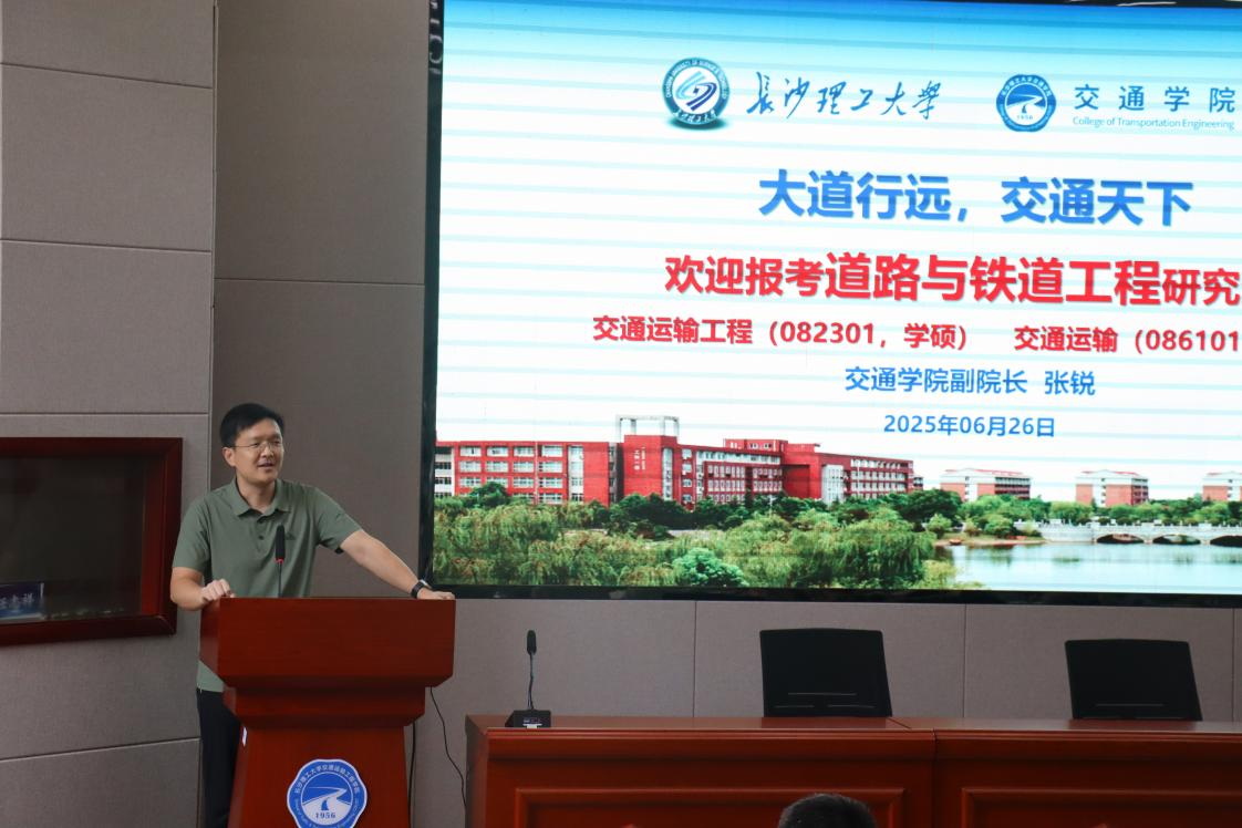郝威介绍了参会领导,2026年学院研究生招生情况进行全面介绍。张锐教授围绕道铁专业的专业设置、培养方案及就业前景等方面,结合学院交通类学科优势,为同学们解读了相关信息,让同学们对学院的研究生教育有了初步认识。龙科军教授围绕学院的交规和信控专业,分享了信息化领域与交通学院专业结合的优势及发展方向,为面临考研抉择的学生提供路径指引。