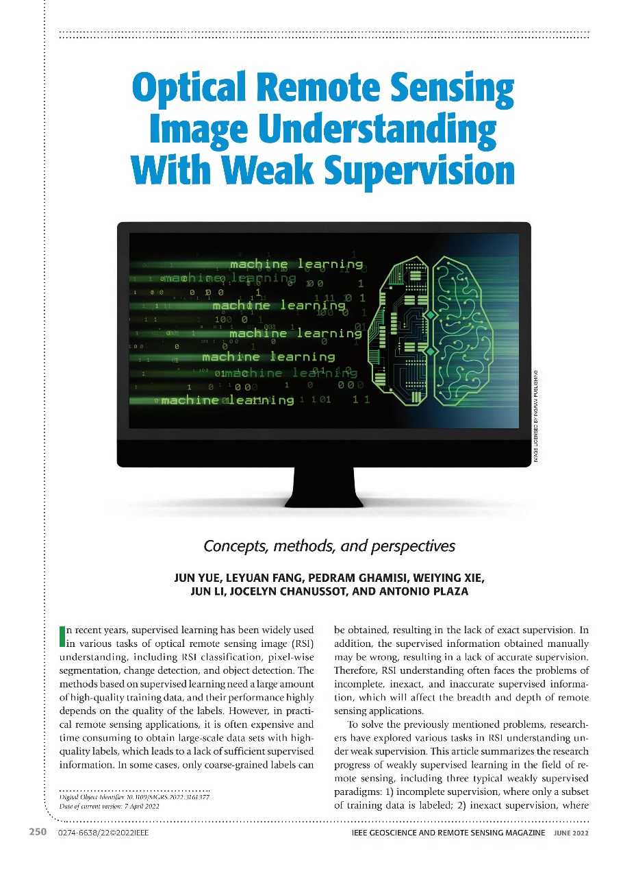 近日,我院测绘工程系岳俊老师以第一作者在遥感领域著名期刊《IEEE Geoscience and Remote Sensing Magazine》(IEEE GRSM)发表题为"Optical Remote Sensing Image Understanding With Weak Supervision: Concepts, methods, and perspectives"的论文,该论文被选为IEEE GRSM第10卷第2期封面论文(ON THE COVER)。论文合作单位包括湖南大学、中山大学、西安电子科技大学、德国德累斯顿-罗森多夫赫尔姆霍兹中心(HZDR)、法国格勒诺布尔理工学院以及西班牙埃斯特雷马杜拉大学。该项工作得到国家自然科学基金项目、湖南省自然科学基金项目和湖南省教育厅优秀青年项目的共同资助。