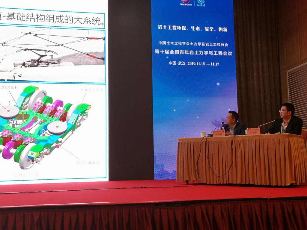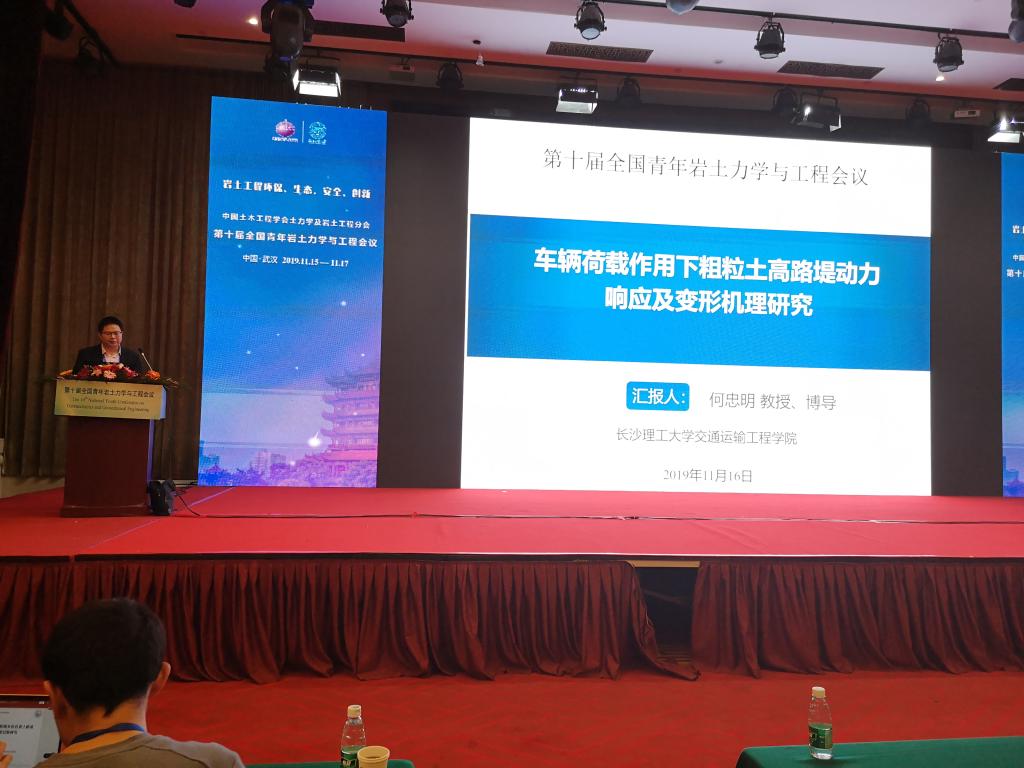 2019年11月15日至17日,由中国土木工程学会土力学及岩土工程分会主办的第十届全国青年岩土力学与工程会议在湖北武汉召开。交通运输工程学院何忠明教授、高乾丰老师和研究生向达等参加了这次会议。何忠明教授受邀担任了本次大会分会场一“岩土动力特性”和研究生专场报告二的主持人,并作了题为“车辆荷载作用下粗粒土高路堤动力响应及变形机理”的特邀报告。