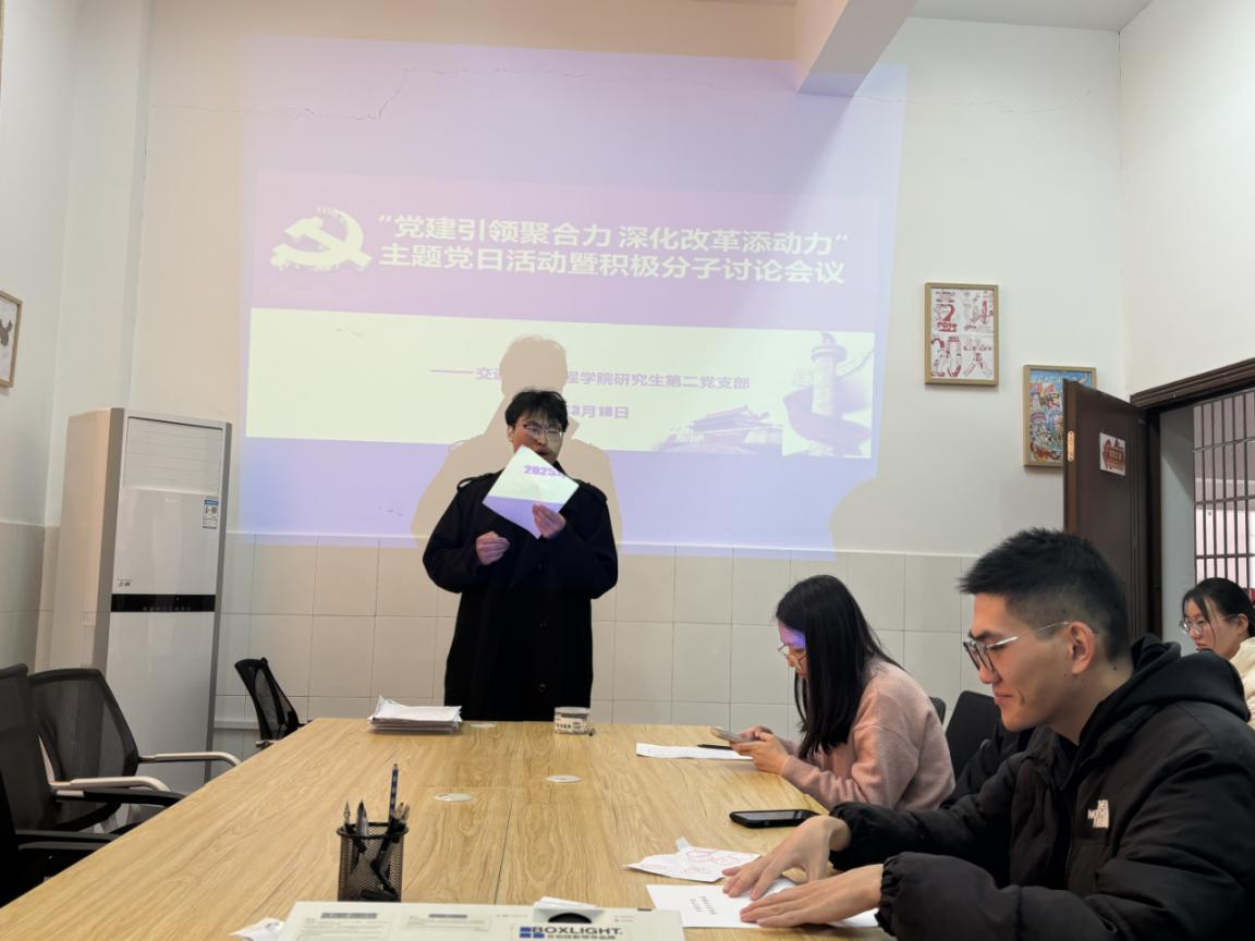 为进一步规范党员发展流程,扎实做好党员培养教育工作,切实提升党组织凝聚力与战斗力,近日,LETOU体育平台交通学院研究生第二党支部于学院会议室召开入党积极分子讨论大会。支部全体党员、入党积极分子齐聚一堂,会议在庄重而热烈的氛围中拉开帷幕,由党支部书记肖梦泽主持。